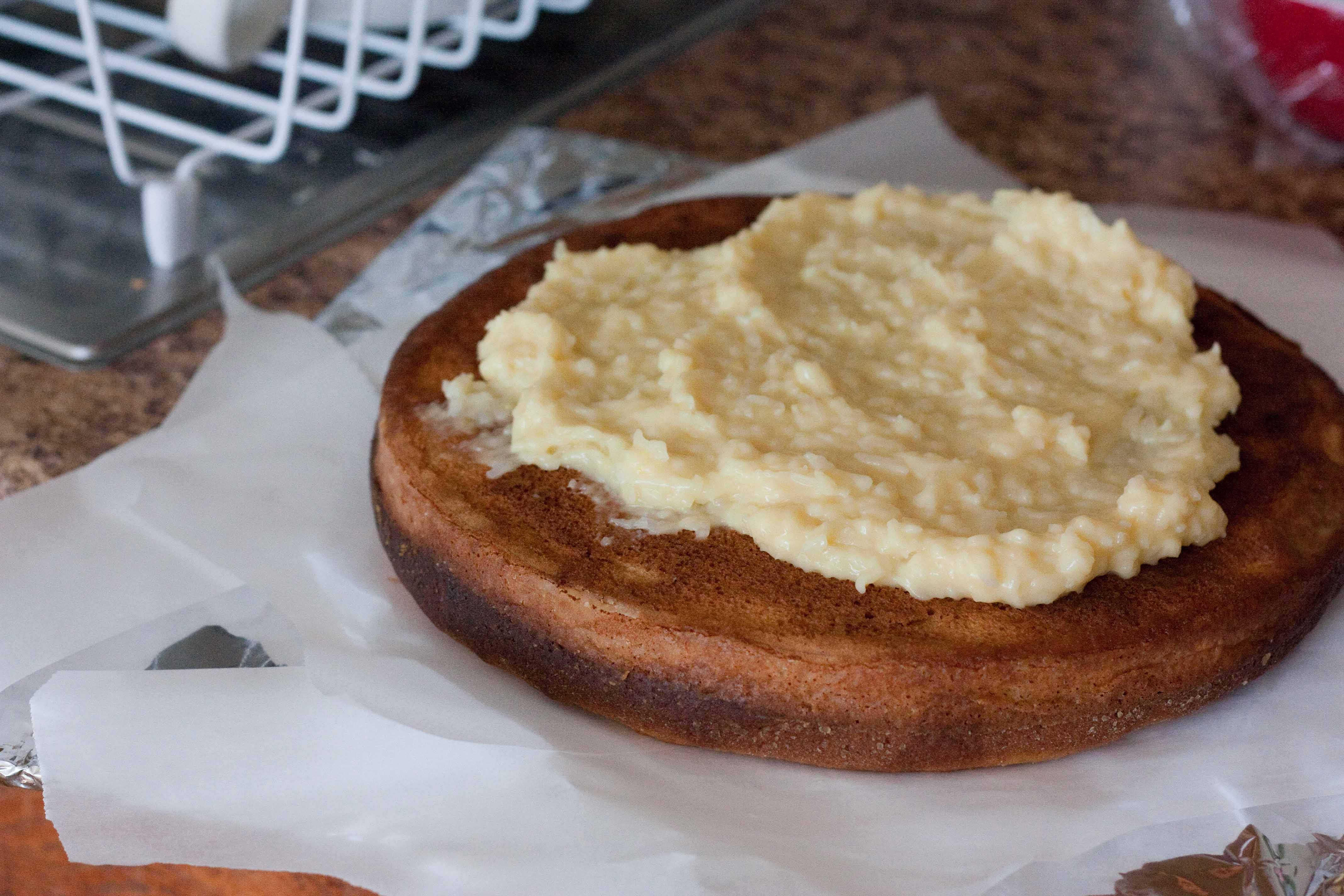 Assemble cake. Cut off the tops of the cakes so you have a level surface. Lay down the first layer, then put down a layer of the filling in the center, don’t spread it to the edges, it’ll over flow. If you only do two layers then place the top layer. If not, repeat. Cover in a thin layer for frosting, then chill in the freezer for 15 minutes. Apply a thicker layer of frosting, decorate, chill again and serve.
