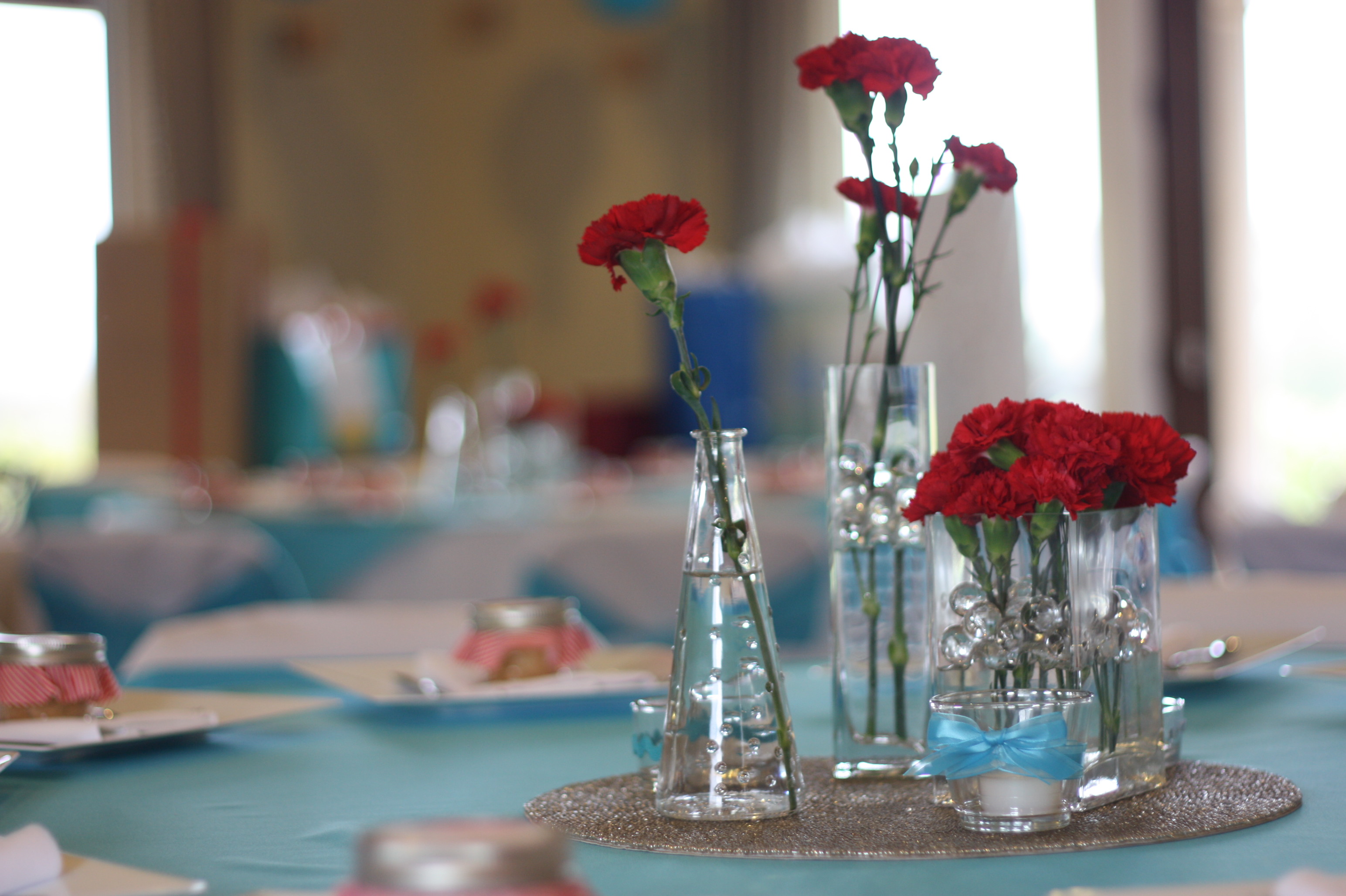 The center pieces were simple, candles with red flowers to fit the red and blue theme.