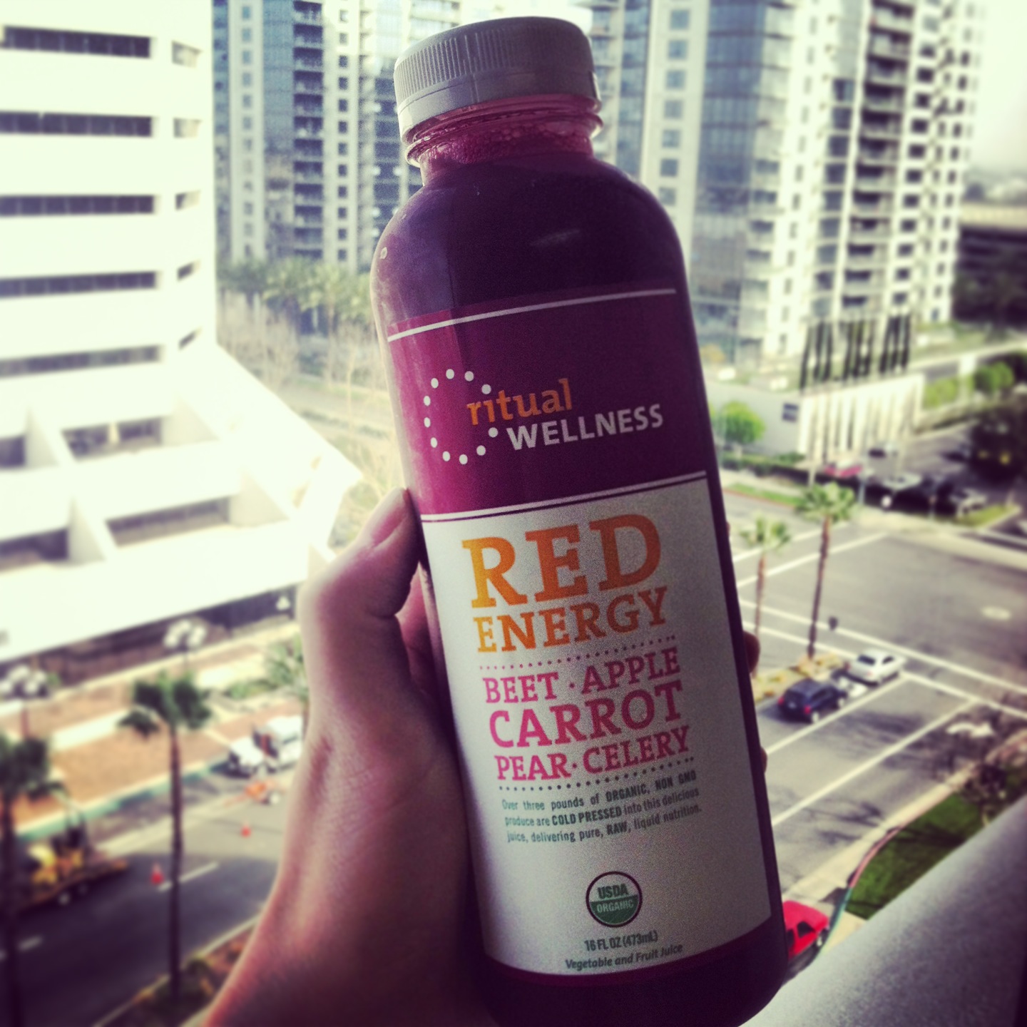That morning I woke up with big dark bags under my eyes and I knew something had to change.  So I drove over to the Ritual JuiceBox at the CAMP on my way to work (job #1, NOT at Ritual) and picked up a one-day Seasonal Reset Cleanse.  If you’re in the OC area, you can stop by any one of the 3 locations and pick up a cleanse (if not you can order online and have it delivered to your door).  It’s super easy.  At the store, you can sample all the flavors to make sure you like them and go home with a cleanse you’ll like.  I picked up the Season Reset Cleanse, but instead of the seasonal flavor, which is Cranberry Orange right now, I chose Red Energy because I like it better.   So here it goes…